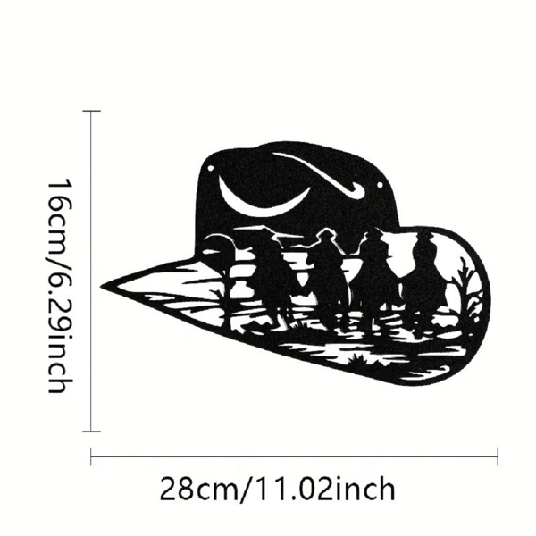 This stylish aluminum Western cowboy hat silhouette wall art brings rustic charm and adventurous spirit to your home, perfect for adding a unique country touch to any room.Crafted from lightweight and durable aluminum, this wall decor features a classic cowboy hat silhouette design with a distressed finish for an authentic Western look, easy to hang and maintain.Dimensions: 28cm (11.02in) × 16cm (6.29in)Material: Sturdy iron (metal)Style: Western cowboy hat silhouette (with horseback rider motif), rustic country theme wall decor