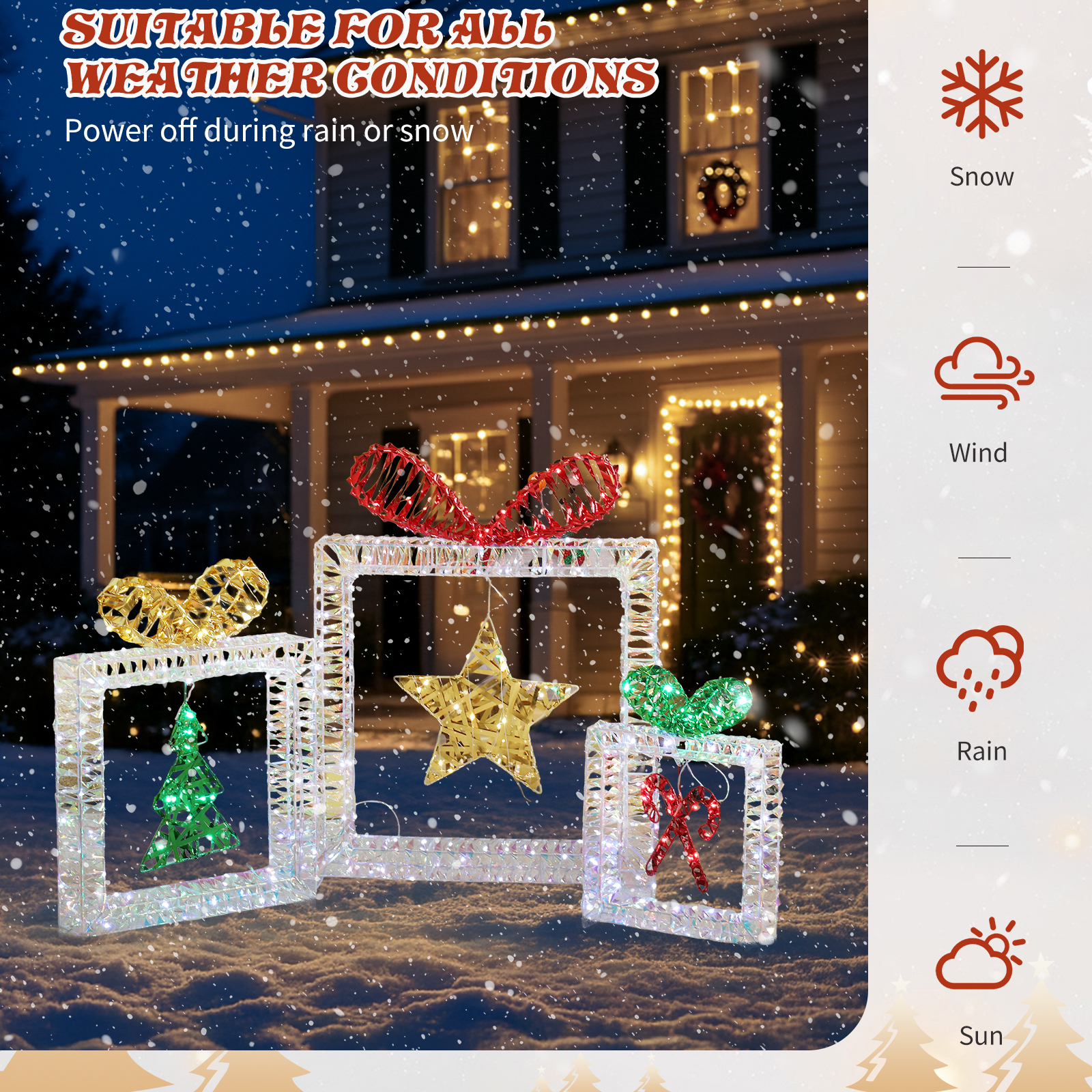 4. Weather-Resistant and Sturdy Build: Made from a durable, rustproof metal frame with sparkling tinsel fabric, this set is built for outdoor use, ensuring it remains a beautiful part of your holiday decor year after year.